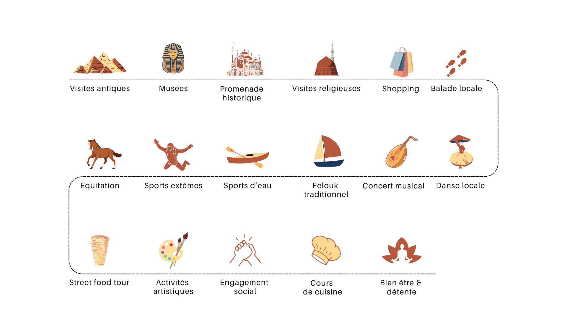 Explorer l’Égypte antique à travers les pyramides de Gizeh et les musées monumentaux, partir à la découverte des sites historiques et admirer le mélange unique des cultures égyptiennes, sans oublier les mosquées majestueuses et églises anciennes, symboles de la coexistence religieuse. Profiter d’activités sur le Nil, comme le kayak, sur une felouk ou d’autres sports nautiques. Flâner dans les rues et souks animés, goûter à la cuisine égyptienne authentique, et participer à des spectacles de danse traditionnelle ou à des soirées musicales égyptiennes. Découvrir la vie nocturne du Caire, vibrante et pleine de surprises.
